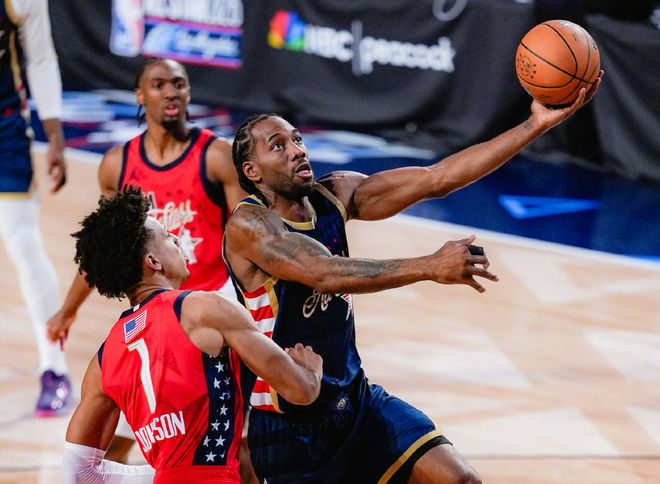 小试牛刀!面对世界队,对位的是本届全明星最努力的另外一位球星:文班亚马,结果伦纳德打满12分钟,13中11,爆砍31分3篮板2抢断!场边的库里和老詹都成小迷弟,当伦纳德无解三分再中后,起立挥手非常兴奋。文班亚马自己都说:我从一开始就防守伦纳德了,确实拼尽全力去防了!而决赛打美国新星队,伦纳德又打满了12分钟,4中0,拿到1分1篮板1助攻。你们多久没在全明星舞台上,看到过三人包夹围堵一名全明星递补了?伦纳德做到了,为了限制伦纳德得分,对手三人包夹车轮战!于是伦纳德数据,最终定格在34分钟轰下37分。