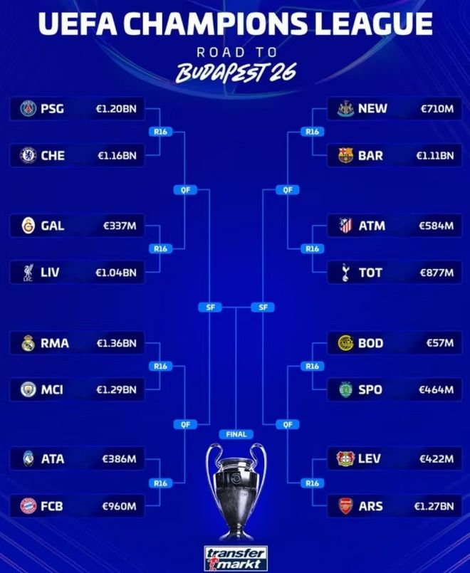 当然了,对于部分球队来说,抽签的对手是谁其实并不重要了——拿排名第五和第六的切尔西和巴萨来说,两支球队在欧冠八分之一决赛的对手,是排位较高的大巴黎和纽卡,即战力和纸面实力都是独一档的存在,相当于两杯毒酒里选一杯,就恩怨来看,巴萨在小组赛阶段和两支球队都有交手,切尔西在世俱杯决赛刚刚干碎了大巴黎,英超和纽卡也是打的有来有回,无论抽成什么样,都是故人相逢——最终,切尔西和大巴黎延续了欧冠赛场上的仇怨,而纽卡则要和巴萨再过招两个回合。